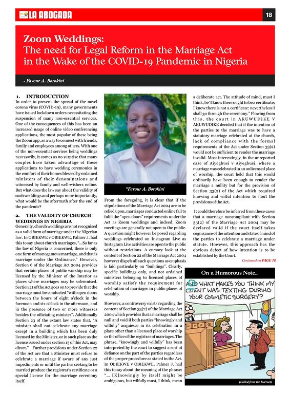 Borokini, Favour. “Zoom Weddings; The Need for Legal Reform in The Marriage Act in the Wake of the Covid-19 Pandemic in Nigeria.” La Abogada, La Federación Internacional de Abogadas (The Internatioal Federation of Women Lawyers), 2020.